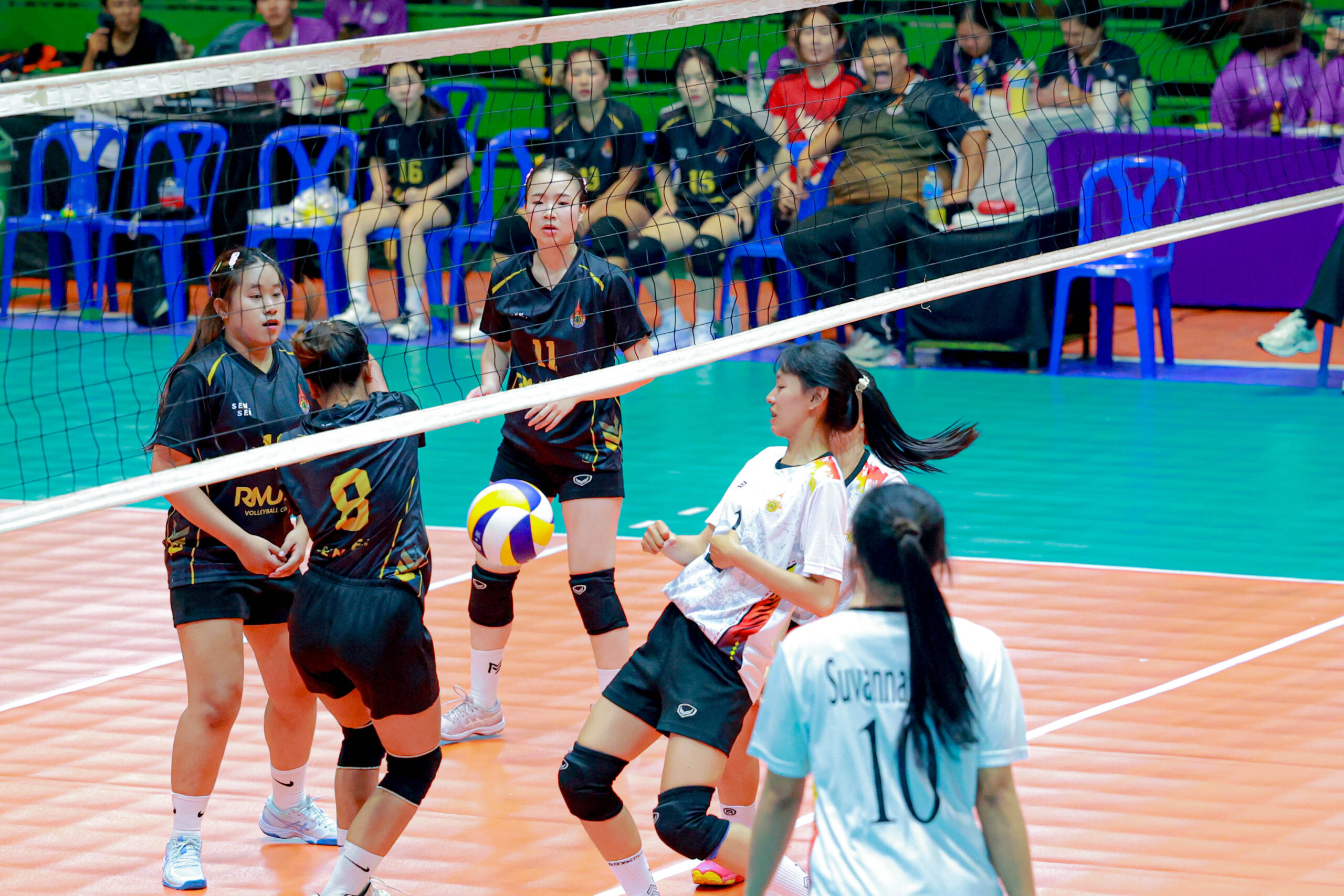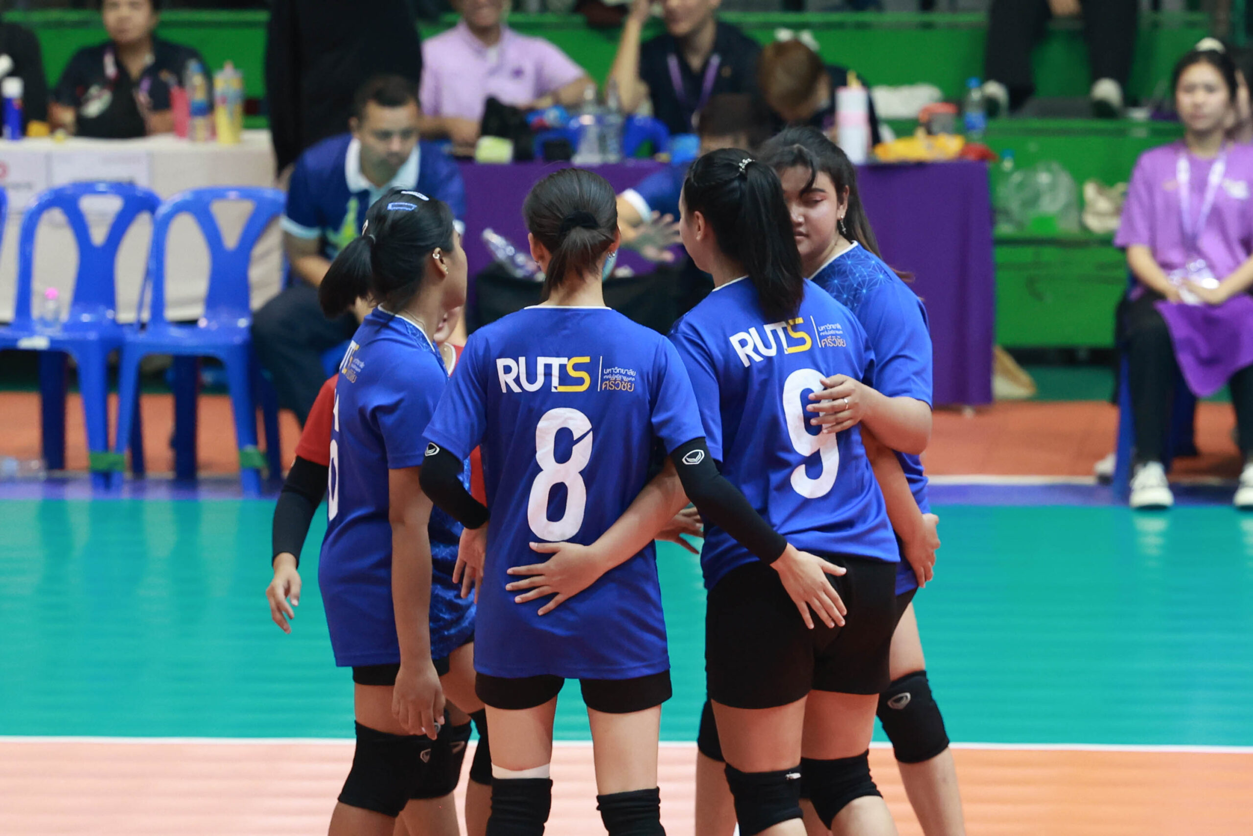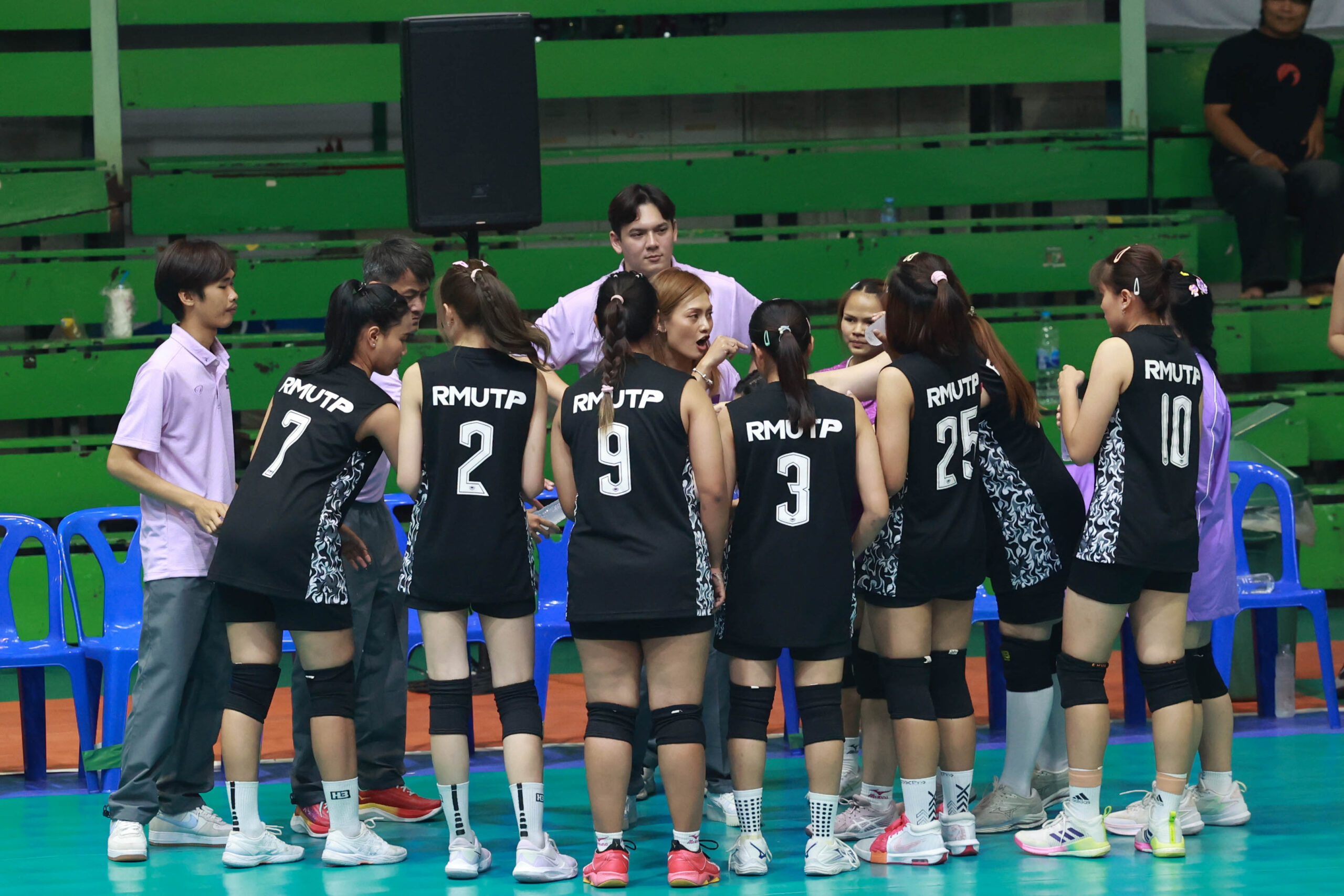 นักตบสาวทีมเจ้าภาพ มทร.พระนครช่วยกันตบเอาชนะมทร.ศรีวิชัย 3 เซตรวด