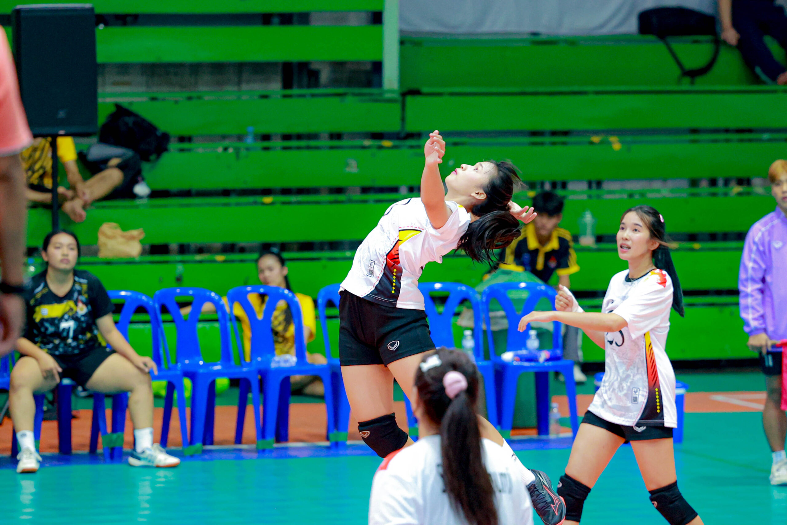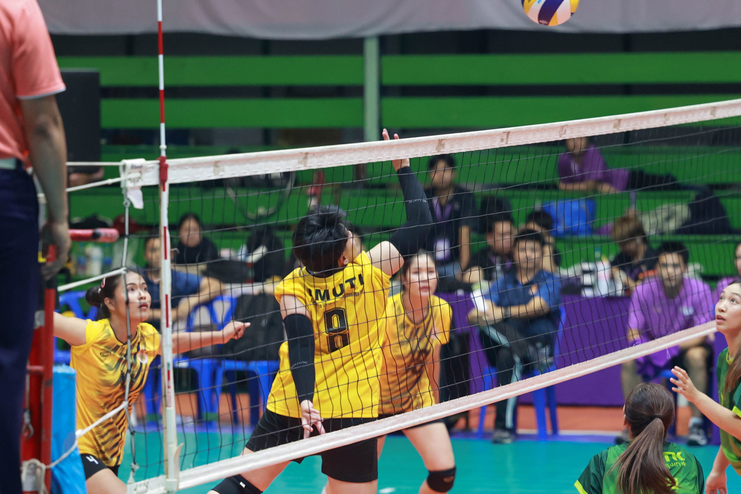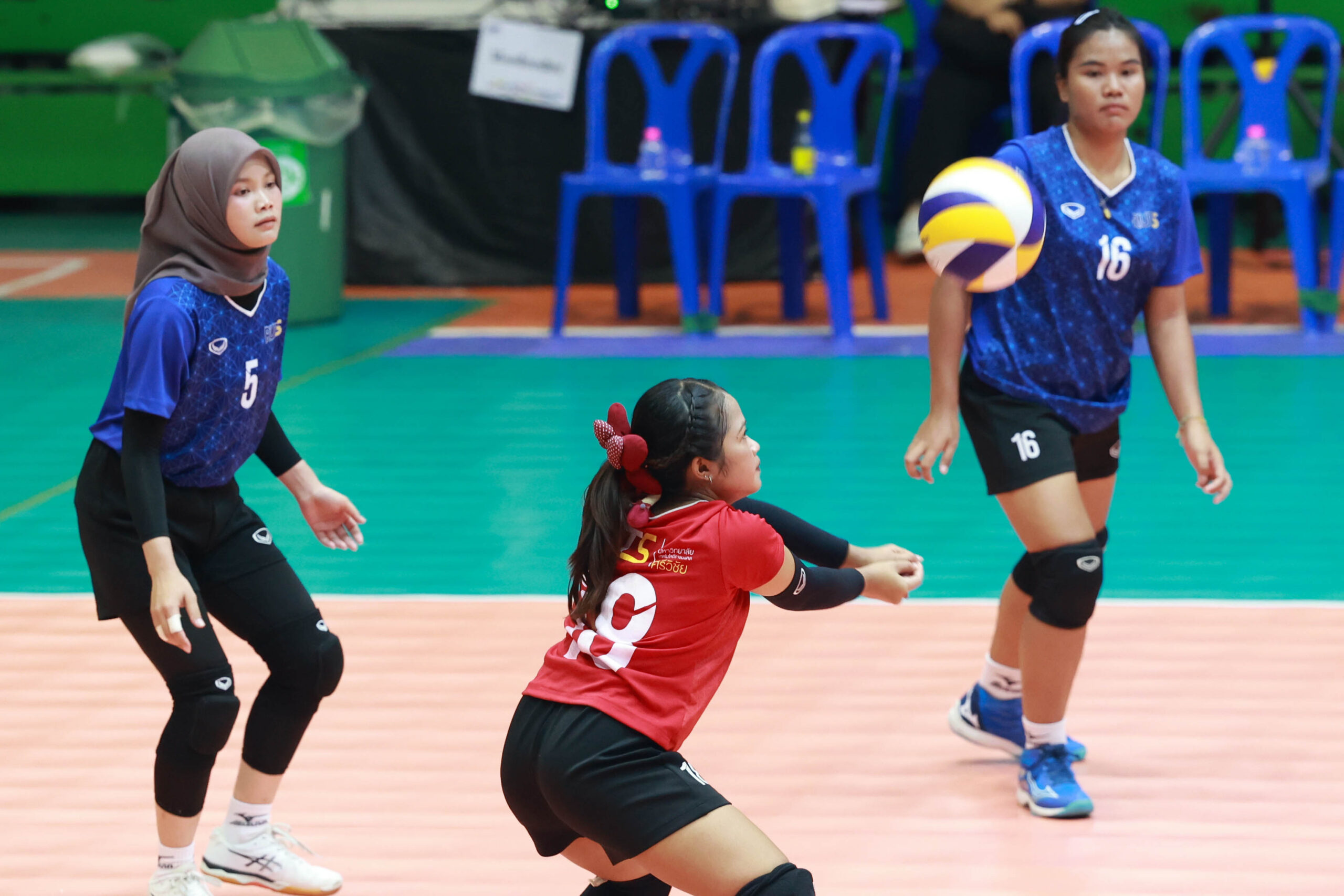 นักตบสาวทีมเจ้าภาพ มทร.พระนครช่วยกันตบเอาชนะมทร.ศรีวิชัย 3 เซตรวด